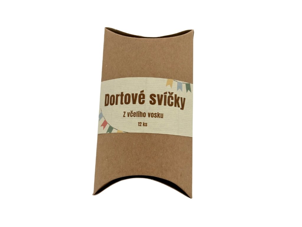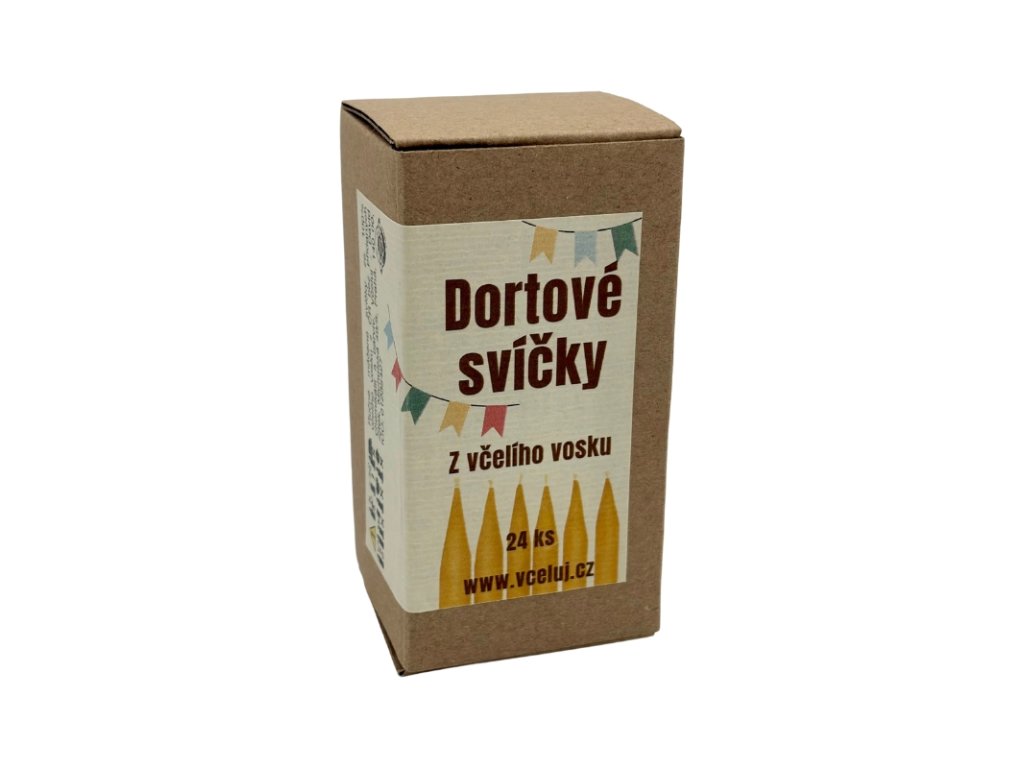 Ručně máčené dortové svíčky z 100% včelího vosku v dárkové krabičce po 12 nebo 24 ks. Jemná medová vůně a přírodní složení bez chemie.