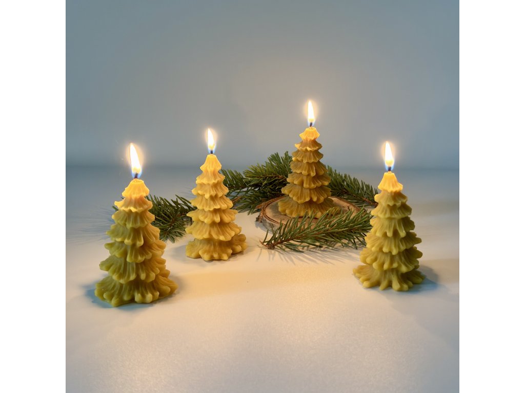Ručně litá svíčka z včelího vosku ve tvaru vánočního stromečku (9 cm). Jemná medová vůně a kouzlo Vánoc v přírodní podobě.